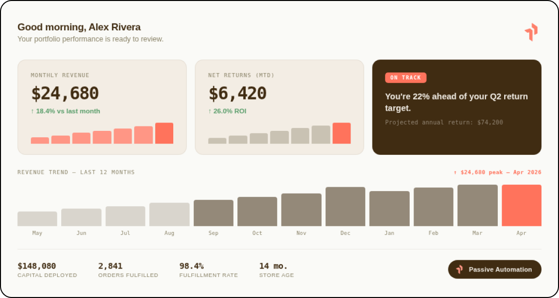 We bridge the gap. Our turnkey model handles every layer of e-commerce operations — from store buildout and product sourcing to ad management and fulfillment — so your capital is deployed into a professionally managed, revenue-generating asset from day one.